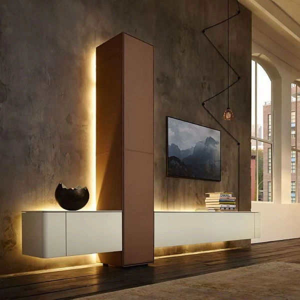 Für diese hülsta Gentis Wohnwand 1 ist die Installation einer indirekten Beleuchtung möglich (siehe Foto). Diese besteht aus einem Funktionsrahmen (Lack weiß) für jedes Element und der entsprechenden LED-Beleuchtung für die Funktionsrahmen. Gesteuert wird die Beleuchtung über eine Funkfernbedienung mit Farbtemperaturwechsel (kaltweiß – 6500K bis warmweiß – 2700K).