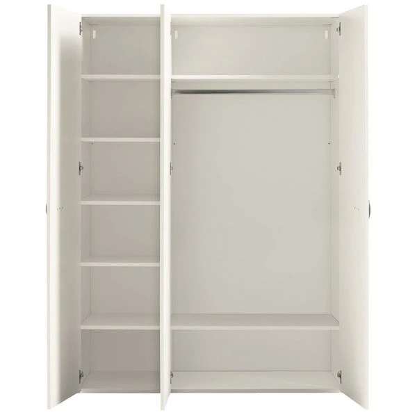 Der Kleiderschrank ist mit 3 Türen ausgestattet. Innen befinden sich links 5 Einlegeböden, rechts 2 Einlegeböden und 1 Kleiderstange.