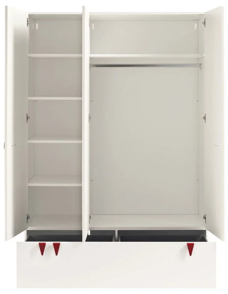 Der hülsta now! minimo Kleiderschrank ist mit 3 Türen und 1 Schublade ausgestattet. Innen befinden sich links 4 Einlegeböden, rechts 1 Einlegeboden und 1 Kleiderstange.
