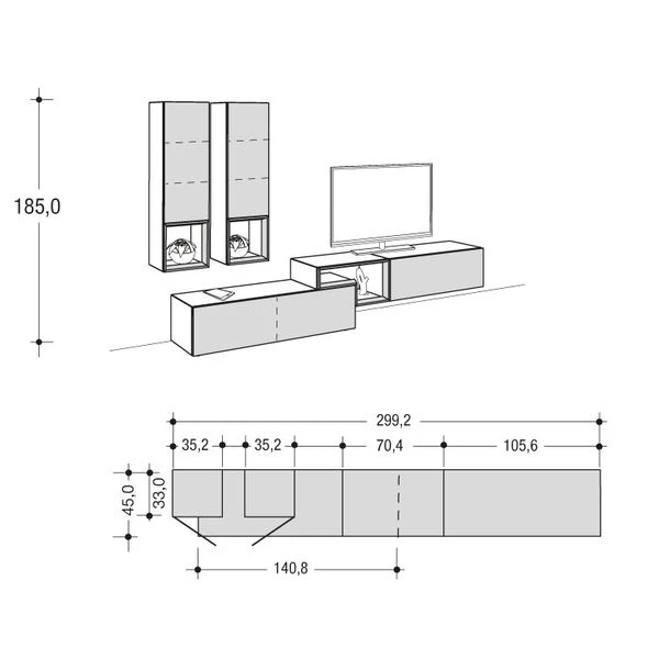 - 1x 2R Lowboard als Standelement mit 1 Schublade – Breite: 140,8 cm, Höhe: 37 cm (inkl. 1,8 cm hohen Sockelverstellern), Tiefe: 45 cm (Oberfläche Lack)