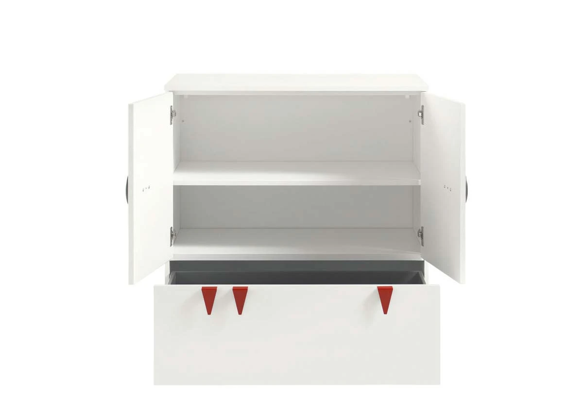 Farbe: Weiß Versand & Lieferdetails: Die Lieferung erfolgt über Speditionsversand, frei Bordsteinkante. Ihre Ware erreicht Sie sicher verpackt auf einer Einwegpalette. Die Palette verbleibt bei Ihnen Lieferzustand: Zerlegt, im Karton Material: Melaminharzbeschichtete Spanplatten Produktdetails: Kommode: 2 Türen mit einem Einlegeboden 1 Schublade mit gedämpftem Selbsteinzug als Vollauszug maximale Belastung Einlegeboden 15 kg inkl. 1,8 cm hohen Stellfüßen Höhe ohne Stellfüße: 93,3 cm Höhe mit Stellfüßen: 95,1 cm mit 3 roten "Zähnen" im Design 5 Jahre Herstellergarantie Abmessungen: 90,2 x 53,1 x 93,3 cm (BxTxH)