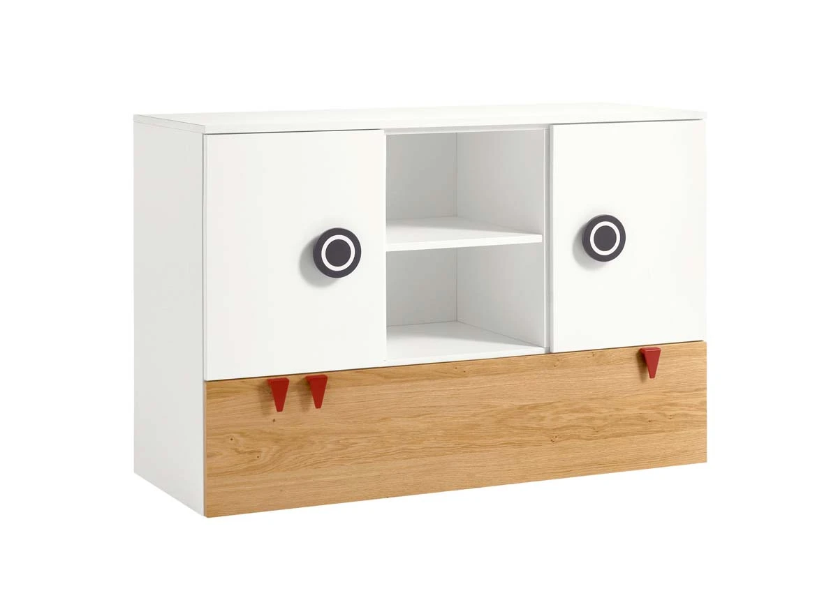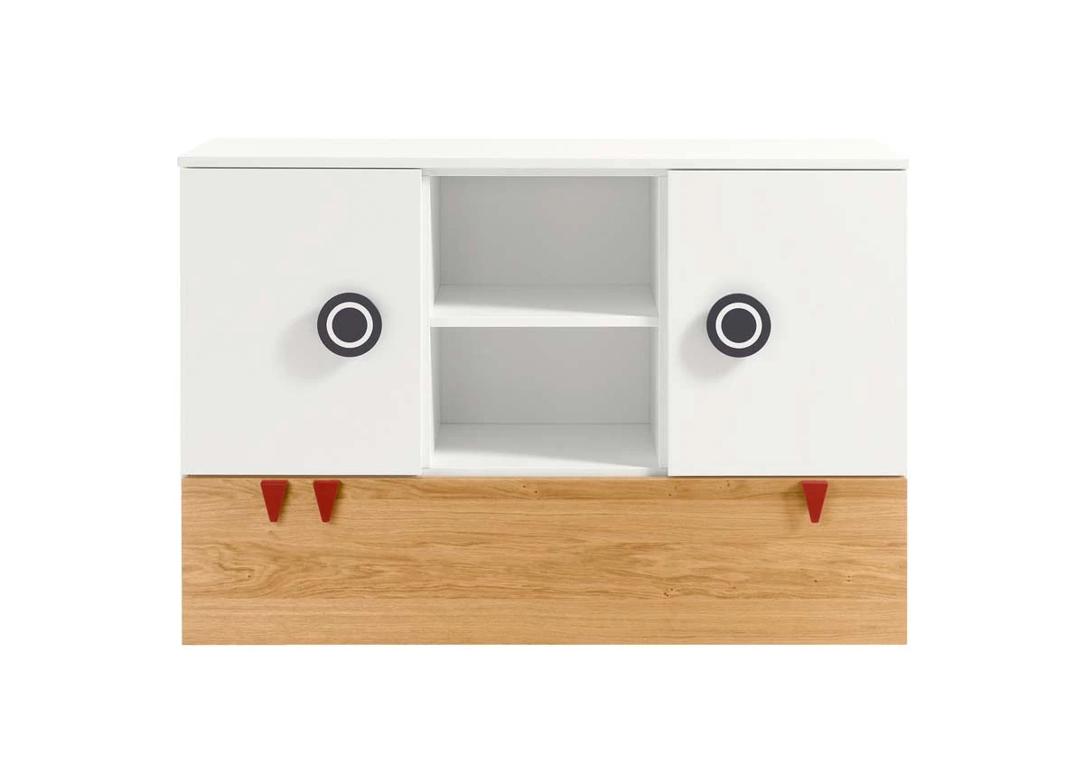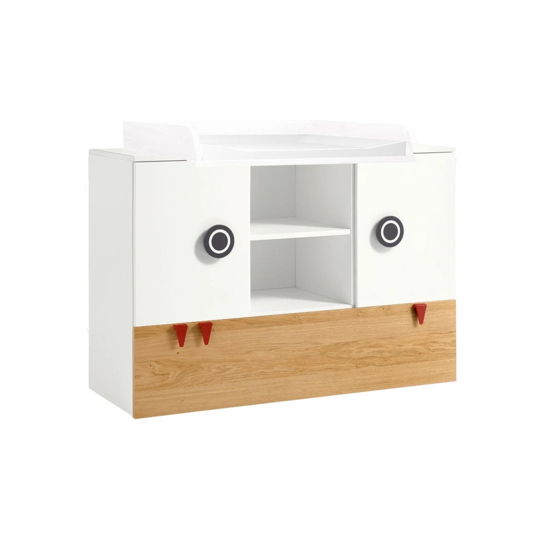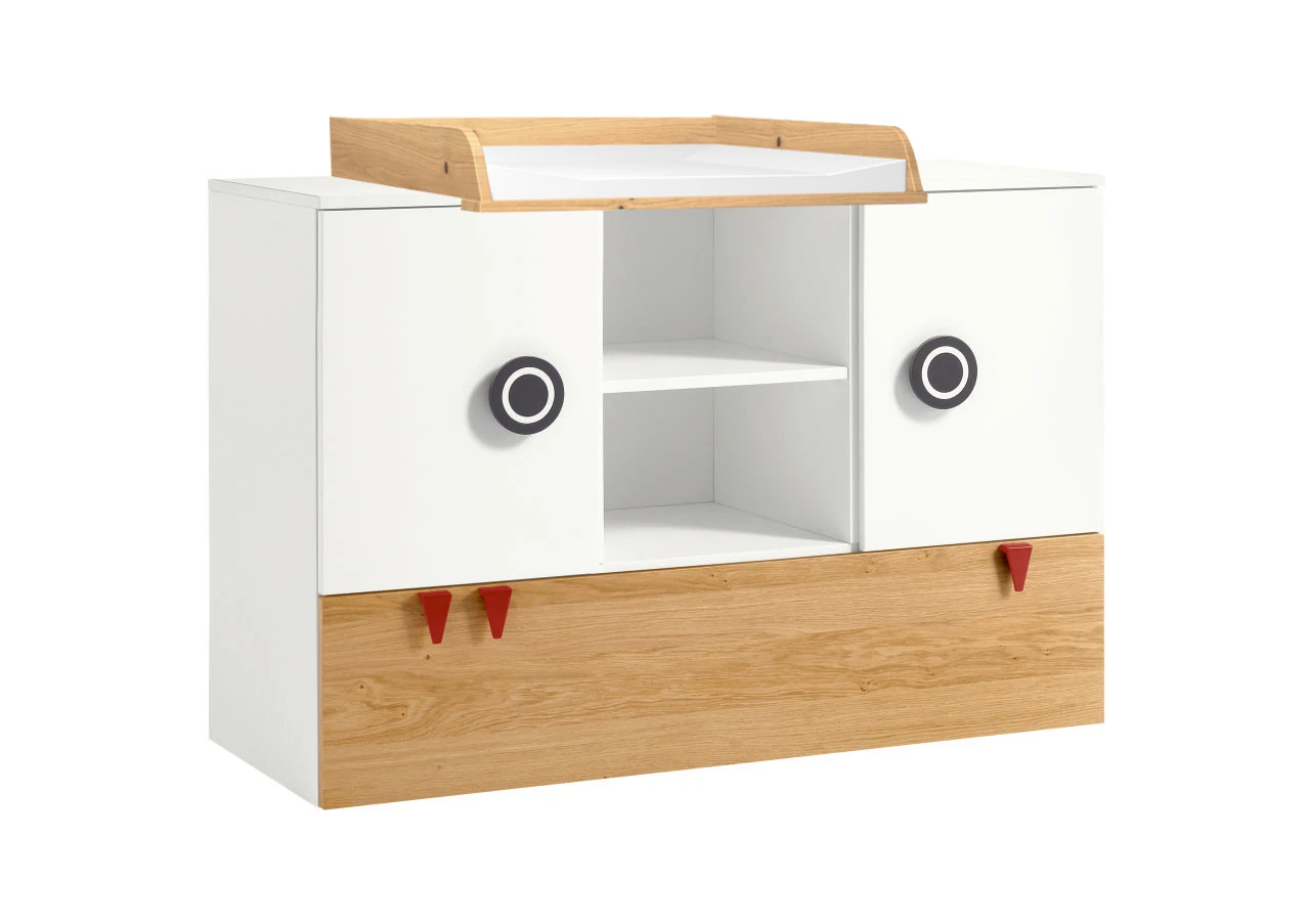 Farbe: Kommode: Weiß / Natureiche Wickelaufsatz: wählbar Versand & Lieferdetails: Die Lieferung erfolgt über Speditionsversand, frei Bordsteinkante. Ihre Ware erreicht Sie sicher verpackt auf einer Einwegpalette. Die Palette verbleibt bei Ihnen Lieferzustand: Zerlegt, im Karton Material: Melaminharzbeschichtete Spanplatten Produktdetails: Wickelkommode: 2 Türen mit je einem Einlegeboden 1 Schublade mit gedämpftem Selbsteinzug als Vollauszug 2 offene Fächer maximale Belastung Einlegeboden 15 kg inkl. 1,8 cm hohen Stellfüßen Höhe ohne Stellfüße: 93,3 cm Höhe mit Stellfüßen: 95,1 cm mit 3 roten "Zähnen" im Design inkl. Wickelaufsatz Wickelauflage: abwaschbarer Bezug mit Thermovliesfüllung Sicherheit durch dreiseitigen Abrollschutz 5 Jahre Herstellergarantie Abmessungen: Kommode: 135,2 x 53,1 x 93,3 cm (BxTxH) Wickelaufsatz: 135,2 x 80 x 14 cm (BxTxH) Unterstellregal jeweils: 18 x 22,5 x 93,3 cm (BxTxH) Wickelauflage: 85 x 70 x 6 cm (BxTxH)
