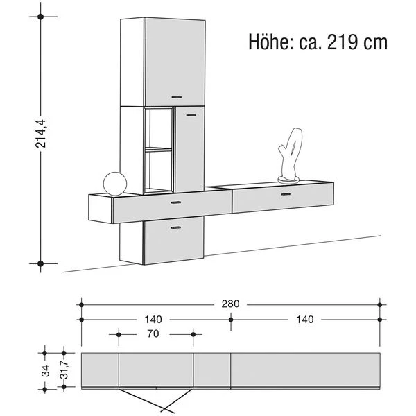 Gesamt: 147 x 280 x 52 cm (H x B x T)