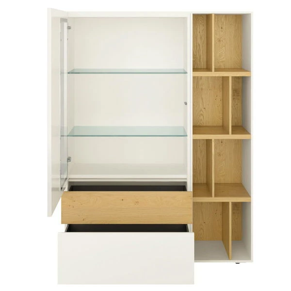 Die now! vision by hülsta Kombination 7 in Lack-weiß/Natureiche/Lack-Hochglanz-weiß verfügt über zwei Schubladen, eine Tür und ein Regal mit offenen Fächern. Die now! Vision by hülsta Möbel fahren eine klare Linie und sind doch überaus wandelbar. Die Oberflächen variieren von klassischen Lack- und Hochglanzlack-Fronten über Akzentausführungen bis hin zu hochwertigen Furnieren.